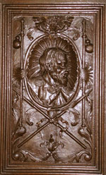 Sur un des panneaux des stalles dans la partie gauche du choeur, un médaillon ovale représente le buste de profil de saint Jacques. Sur un fond rayonnant, le visage offre une physionomie décidée et volontaire; le nez est busqué, le front dégarni, l'oreille dégagée tandis que la chevelure tombe sur la nuque et qu'une fine barbe en pointe prolonge le menton. Le collet aux bords rabattus est fermé par une lanière et marqué de trois coquilles.